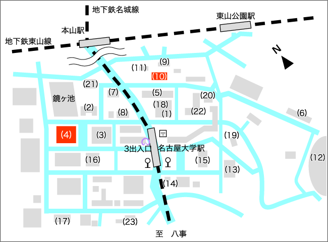 名古屋駅から:名古屋地下鉄東山線「本山駅」にて名城線乗り換え 「名古屋大学駅」下車、3番出口より徒歩3分