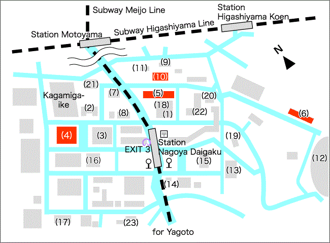 From Nagoya Station: Take the Subway Higashiyama Line to Motoyama Sta. (15 minutes), then transfer to the Subway Meijo Line to Nagoya Daigaku Sta. (Higashiyama Campus is just off the subway exit.).( From the third exit a 3-minute walk